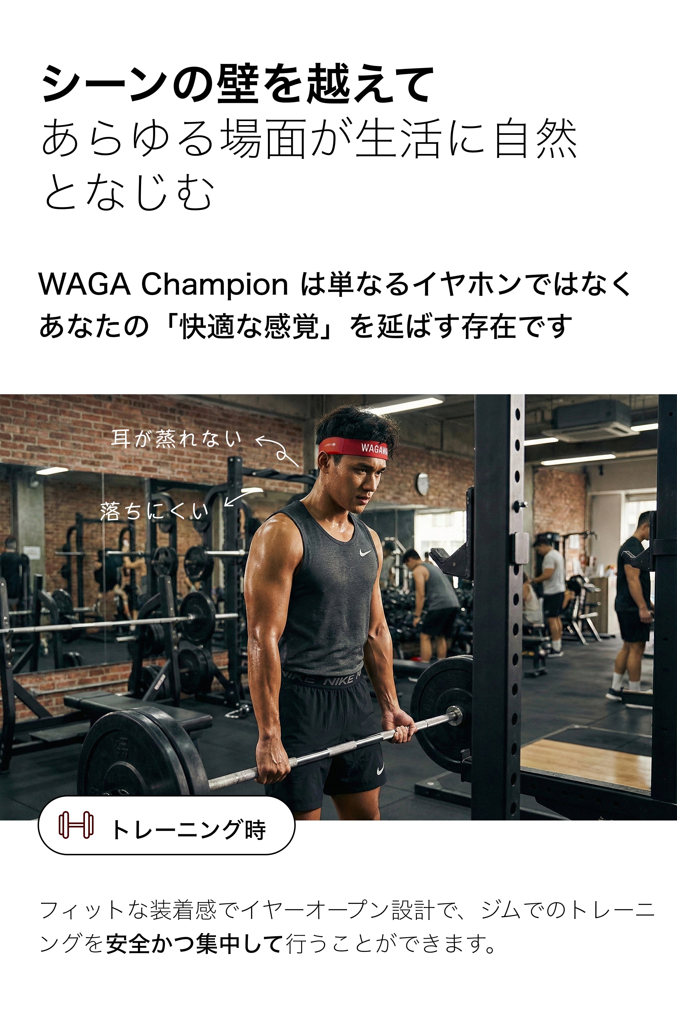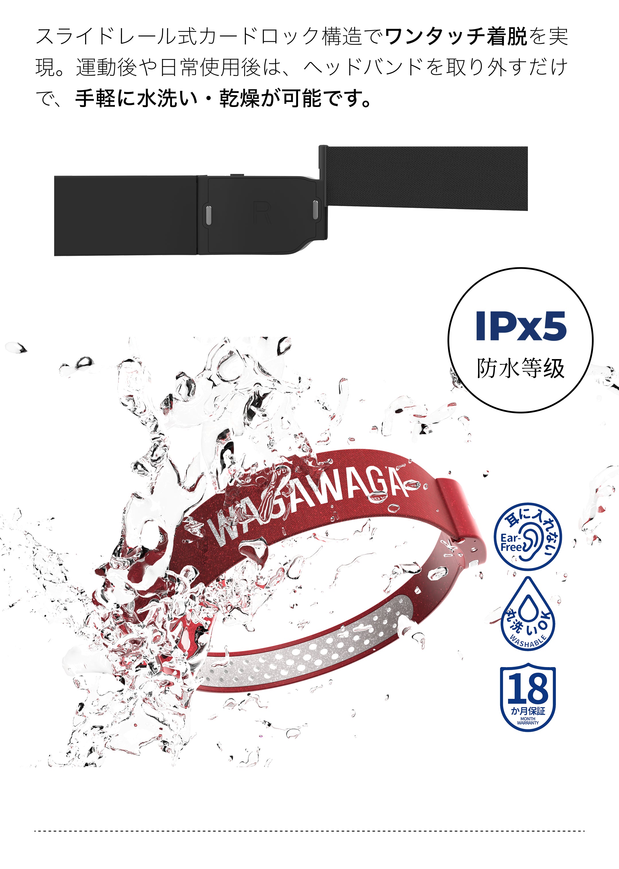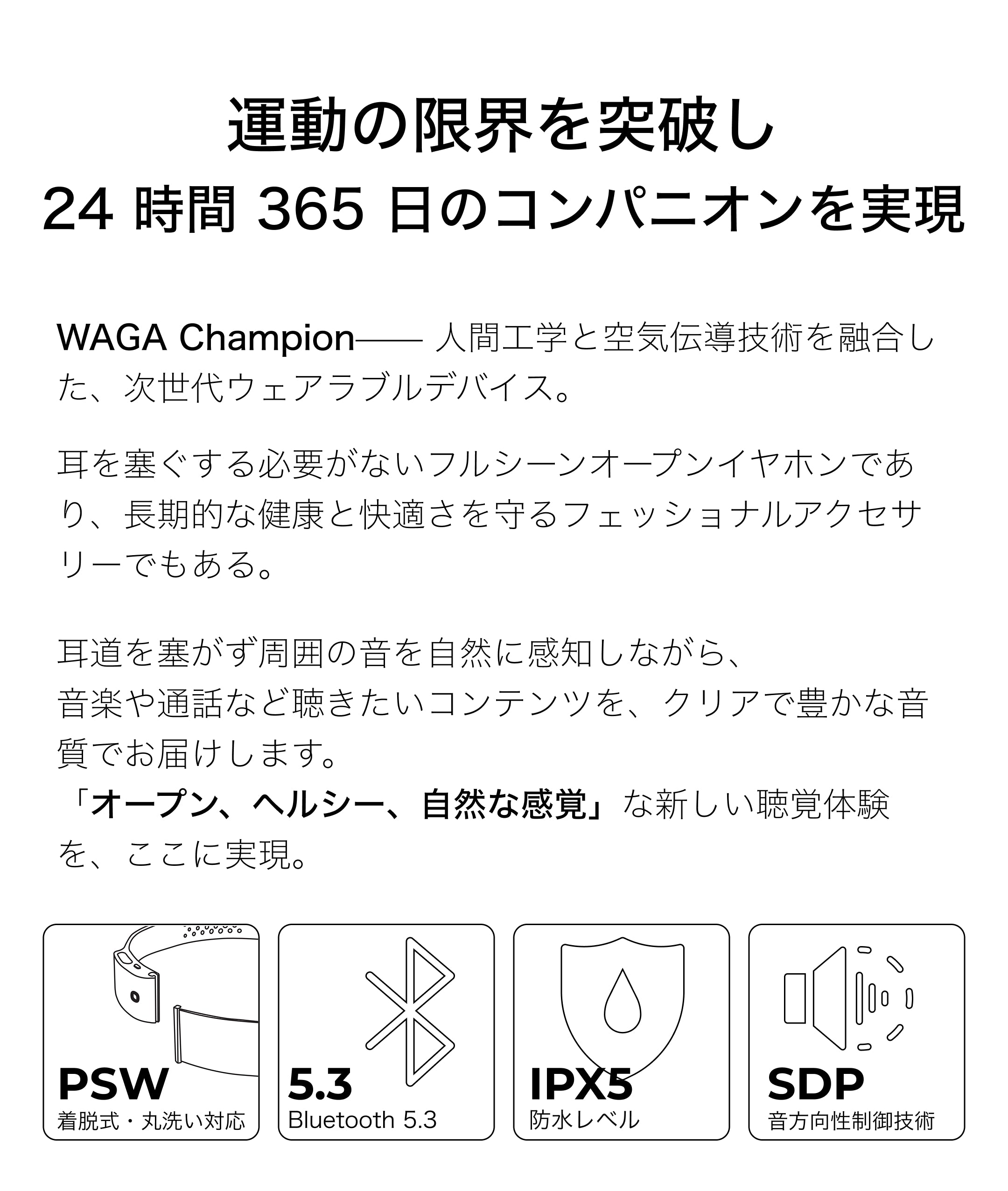 スポーツ専用 空気伝導 Bluetooth 5.3 イヤホン。 着脱式で丸洗い可能。連続再生8時間WAGAWAGA Champion